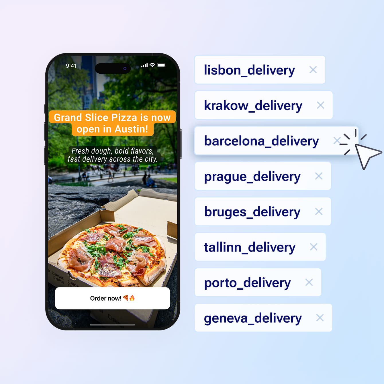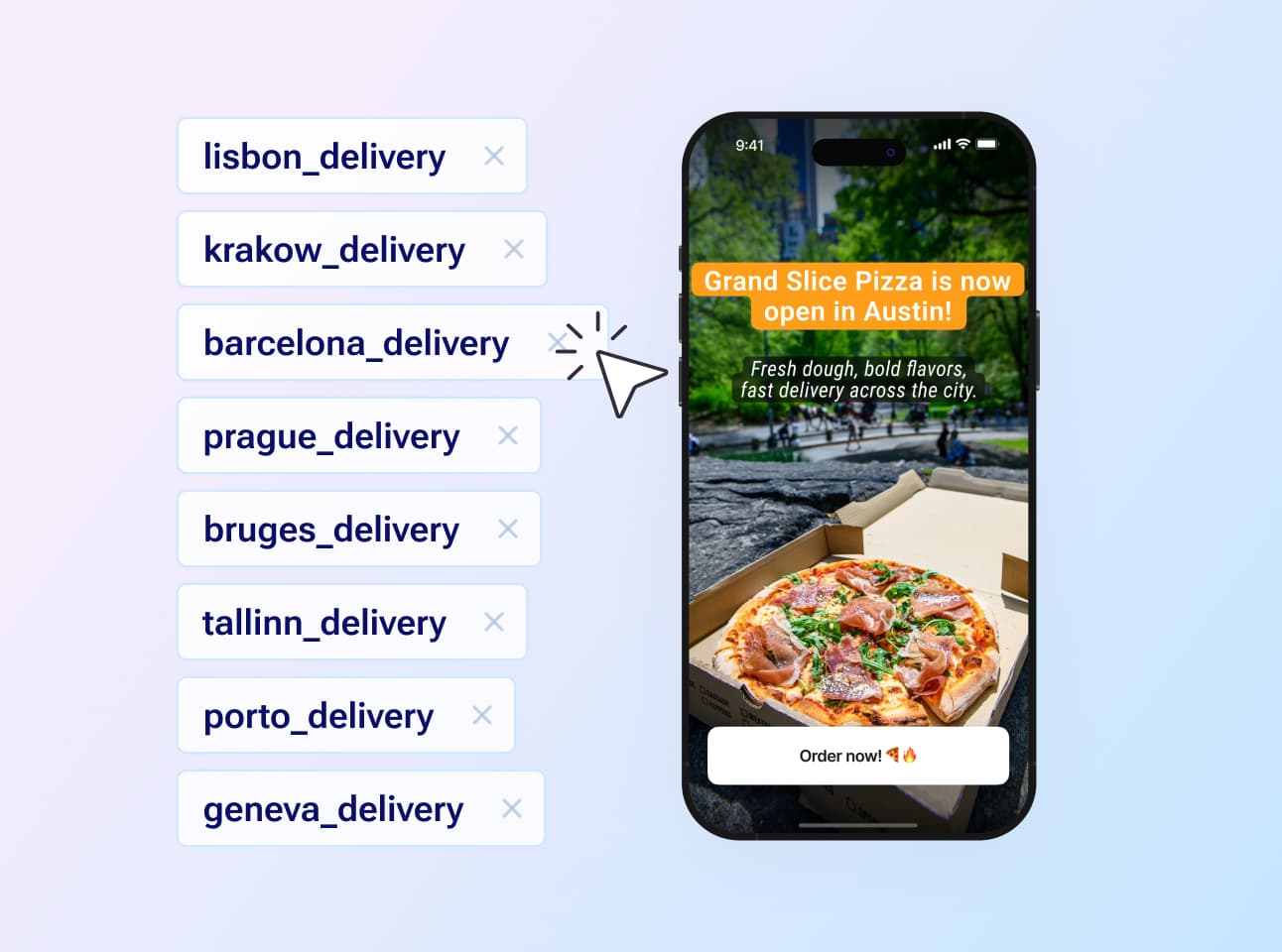 Control message timing with event triggers, scheduling, and frequency limits. Use single-slide or multi-slide formats to match your message.